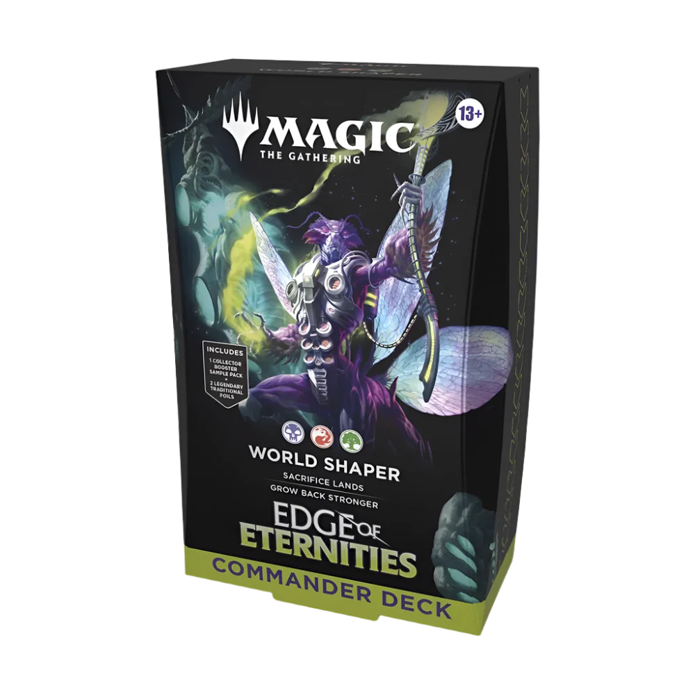 Command the multiverse with unmatched style and strategy. The Edge of Eternities Commander Set brings together four powerful preconstructed decks—ideal for epic multiplayer Magic: The Gathering battles. Whether you’re terraforming the battlefield with World Shaper or outsmarting your rivals with Counter Intelligence, this set gives you double the firepower and double the fun.